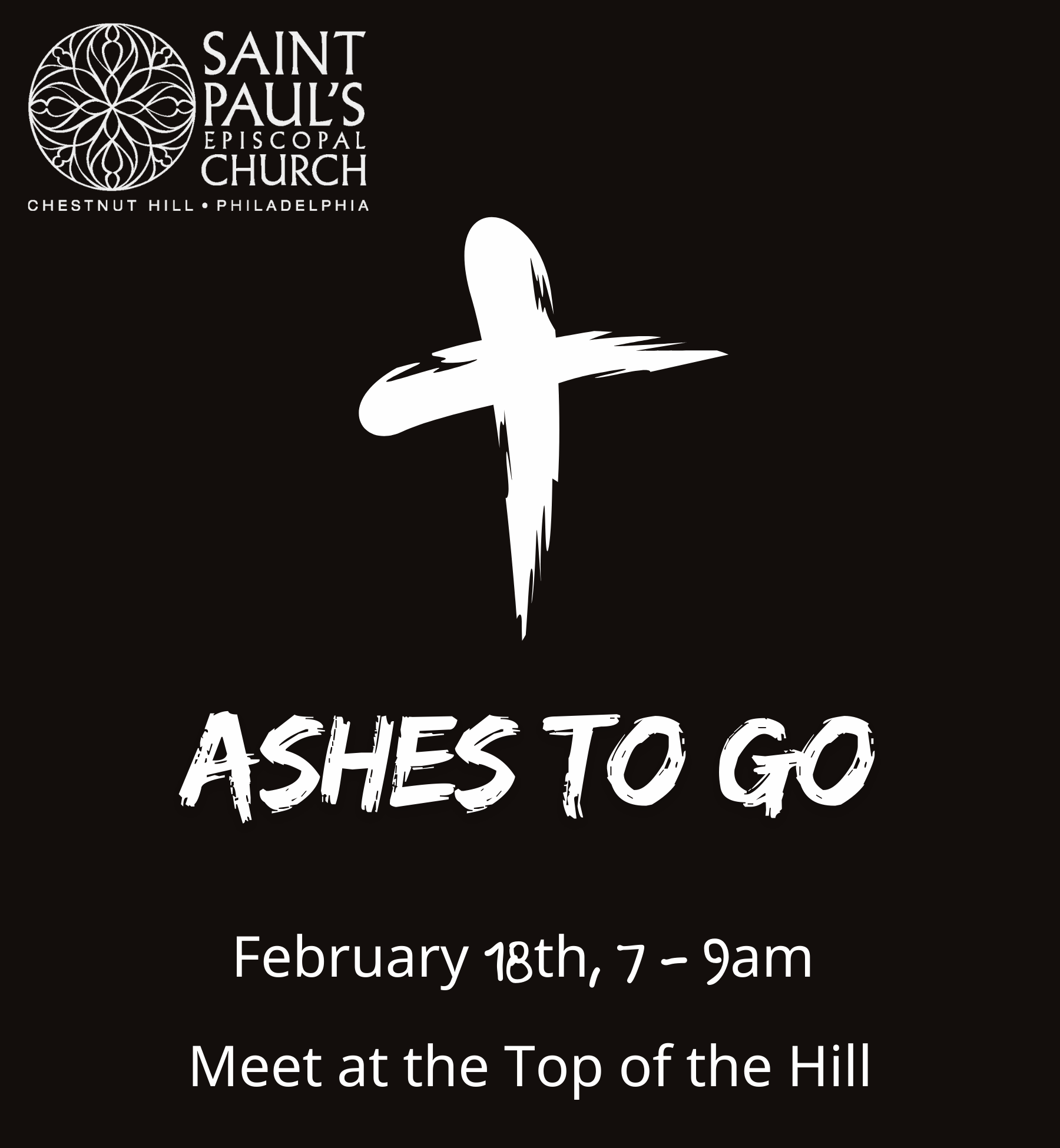 Join us in showing God’s love to our neighbors as we start Lent this year. Father Eric will be distributing “Ashes to Go” on Ash Wednesday, February 18. We’ll meet at the Top of the Hill near the Chestnut Hill West train station and the bus terminal area.